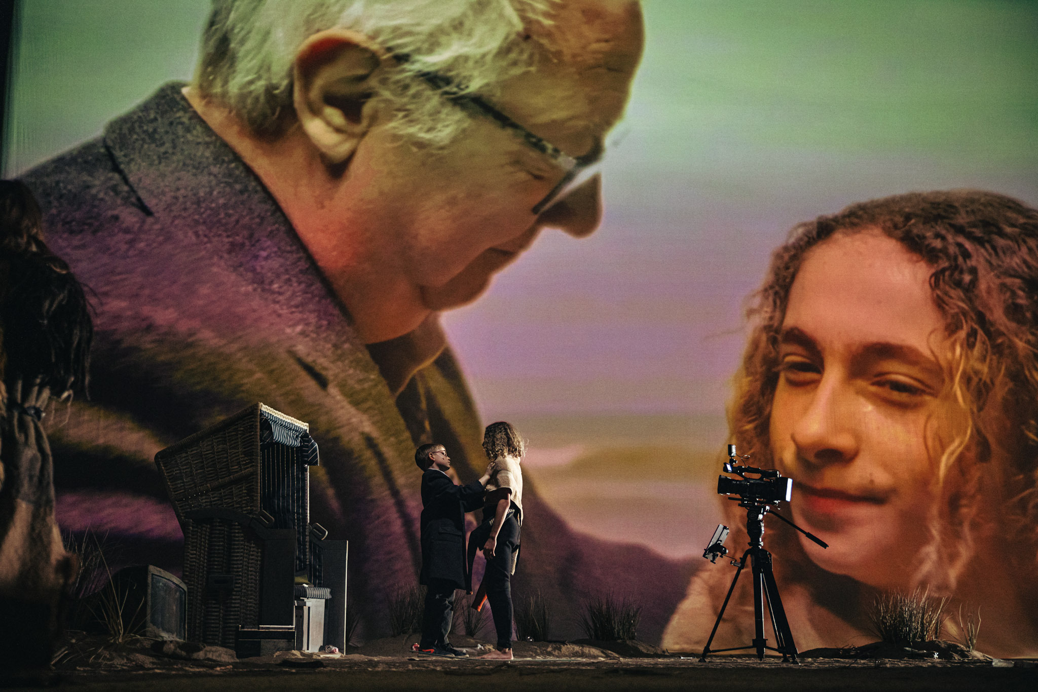 La musica ha anche il compito di segnare cambi e inizi. Dopo Two birds on a wire si alza il sipario e in fondo al palco, su uno schermo, appaiono una spiaggia desolata e un volto di donna battuto dal vento. Sul palco si sollevano volute di sabbia, simbolo del confine con l’infinito e le incognite del mare, attraversato più volte da Medea come quando abbandonò la Colchide, ma anche simbolo dell’instabilità delle umane vicende. Una ragazza interpreta Medea e presta la voce alla donna nel filmato, le cui labbra si muovono silenziosamente. È il racconto, messo in azione, su Medea che aiuta Giasone a sconfiggere il drago (interpretato da Milo Rau) e che infierisce con una violenza che ritornerà e sarà più atroce – il pubblico lo sa bene –. I due, Medea e Giasone, si baciano. “Com’è stato baciarsi in scena?”, chiede il coach. “Abbastanza ok” dice, e fa sorridere, un ragazzo. Si vedrà un altro bacio in Medea’s Children, ma senza essere accompagnato dalle parole di Peter o degli attori, tra il giovanissimo Mounir e il vecchio Dottor Glass. Baci ricorrono in altre tragedie dirette da Rau, anche estremamente difficili da interpretare e per questo oggetto di confronto fra attori, Rau, il suo gruppo di lavoro – penso alla scena ḥarām del bacio fra gli adulti attori iracheni che impersonano Oreste e Pilade in Orestes in Mosul –.