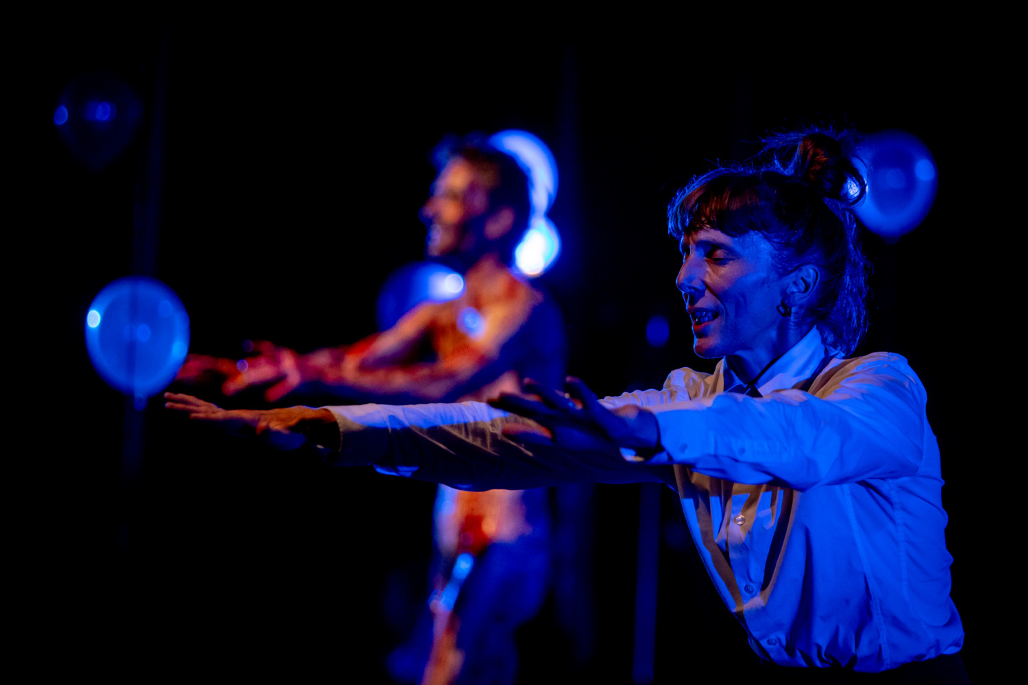 I due performer-poeti si liberano infine dei palloncini: il rumore dello scoppio si confonde con quello delle mitragliatrici fino a perdersi nel leggendario attacco di Heroes di David Bowie. Il corpo della parola LIBERTÉ si svela man mano sul corpo di Annabelle Chambon, celebrando una unione tenace e necessaria fra l’artista – nel senso più ampio – e la libertà, nel nome della creazione, del coraggio, dell’indignazione, della bellezza. Su musica e parole di speranza, amore e resistenza (Heroes), i due corpi danzano, in piedi (Chambron) e in ginocchio (Charron), un inedito pas de deux che libera energie dal buio del nostro tempo.