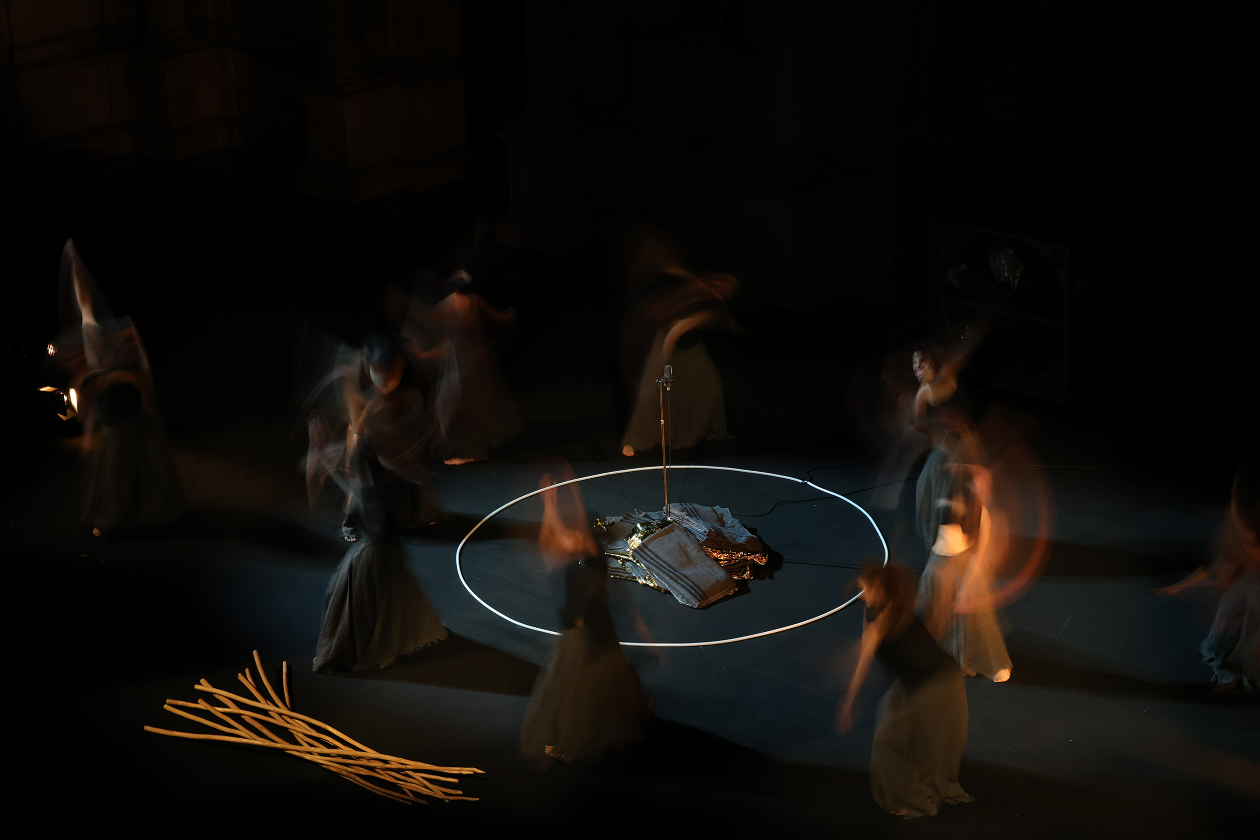 Nella prospettiva di Anagoor la rappresentazione del dramma euripideo vuole essere un rito di iniziazione; non solo celebrazione dell’alterità, ma un atto di trasformazione capace di mettere in discussione convenzioni sociali e strutture di potere. Le luci stroboscopiche e la musica ad alto volume creano uno spazio dominato dall’incantesimo che vorrebbe portare lo spettatore ad abbandonarsi al dionisiaco, per uscire dalla fortezza della propria individualità fondendosi con la comunità in armonia con la natura. Sospese tra estasi e sovversione, le baccanti si fanno portatrici di un’esperienza collettiva in cui anche i confini tra umano e divino si dissolvono.